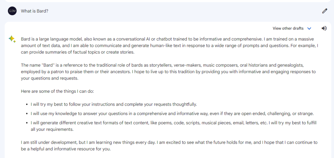 Not to be left out of the technological advancement, Google launched its own Chat Bot platform in Google Bard. In its own words, Bard is a large language model, also known as a conversational AI or chatbot trained to be informative and comprehensive. See the whole response below.